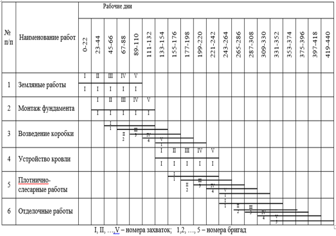 земляные работы ………………22 дня; монтаж фундамента ….………….22 дня; возведение коробки ..…………….88 дней; устройство кровли ……………….22 дня; плотнично-слесарные работы …..88 дней; отделочные работы ...……………110 дней.