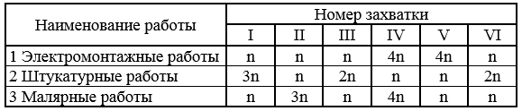 Рассчитаем продолжительности работ на захватках в соответствии с вариантом задания. Полученные данные сведем в таблицу 4.2, учитывая при этом технологическую последовательность работ.