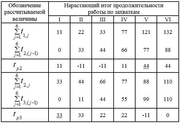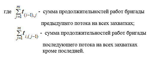 Расчет периода включения в работу бригады последующего потока относительно предыдущего удобно выполнить в табличной форме (таблица 4.3):