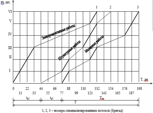 При построении циклограммы проектируемого неритмичного потока (рисунок 4.1) вначале следует выполнить графическое изображение первого специализированного потока. Для того, чтобы следующая бригада не простаивала в ожидании, когда предыдущая бригада освободит фронт работ, период включения в работу последующего потока tр должен быть принят максимальным из полученных расчетах значений: