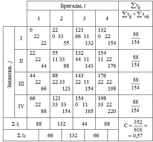 Согласно произведенным расчетам (рисунок 5.1), коэффициент, характеризующий использование фронтов работ бригадами, С = 0,57.