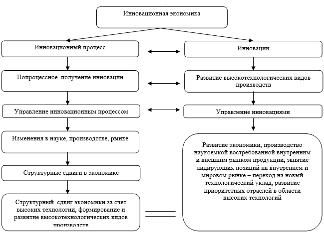 Связывая понятия: экономика и инновации, можно подойти с двух позиций. Во-первых, смена индустриальной экономики на постиндустриальную. Актуальность приобретает инновационное направление развития экономики, где постепенно происходит смена стадий состояний развития экономики, меняется структура экономики с преобладающим развитием высокотехнологичных отраслей и совокупность действий на разных уровнях для способствования инновационному развитию. Во-вторых, подробное рассмотрение самого инновационного процесса изнутри. В данном случае, предполагается получение инновации – это достижение результата. А ход получения инновации - инновационный процесс, то есть последовательная смена состояния, стадий развития - от идеи до получения готовой инновации и дальнейшей ее замены или усовершенствования, оказывающей прямое и косвенное воздействие на экономику.