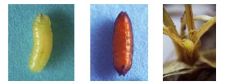 а – личинка; б – пупарий; личинка в стебле пшеницы