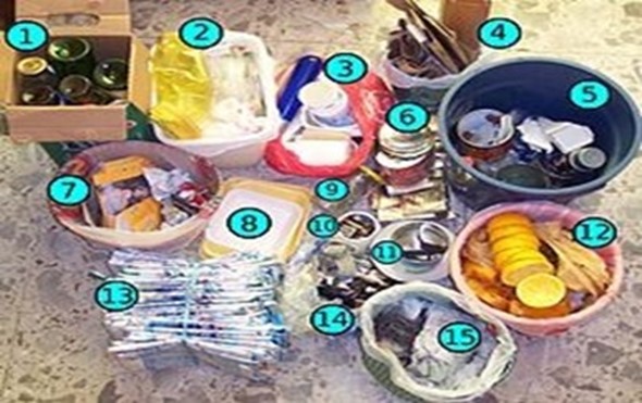 9.7 сурет – Бөлінген тұрмыстық қалдықтар: 1 – шыны бөтелкелер, 2 – жұқа пластик, 3 – қалың пластик, 4 – картон, 5 – аралас қалдықтар, 6 – темір банкалар, 7 – қағаз, 8 – полистирол, 9 – шыны, 10 – батареялар, 11 – металл, 12 – органикалық қалдықтар, 13 – «Тетрапак» қаптамалары, 14 – шүберек, 15 – дәретхана қалдықтары.