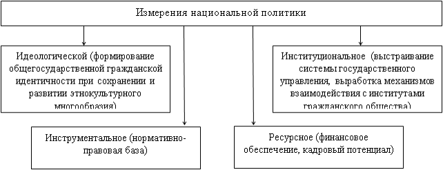 Реализация государственной национальной политики в силу того, что межэтническое взаимодействие охватывает всю сферу общественных отношений, обладает многоаспектной направленностью и имеет несколько измерений, представленных на Рисунке 14.1.1.