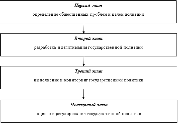С точки зрения взаимного влияния общественных проблем и действий государственных органов власти можно выделить следующую цепочку взаимосвязей: на первом этапе «проблемы общества – государство»; на втором этапе «государство – политическая стратегия»; на третьем этапе «государство – решение проблем»; на заключительном этапе «анализ проблем – действия государства».