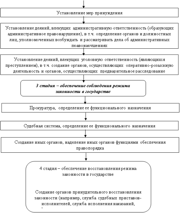 На каждом из этапов в качестве системообразующих центров, определяющих основное содержание этапа, выделяются основные элементы механизма правового регулирования. Вокруг них в качестве своеобразных подсистем группируются все иные юридические явления и процессы, образующие вспомогательные элементы механизма правового регулирования (правосознание, правовая культура, юридическая техника и др.).
