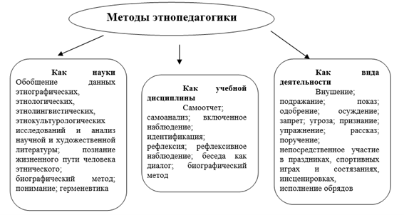 Дифференцируя этнопедагогику как науку (направление педагогической науки), как учебную дисциплину и как вид деятельности взрослых по воспитанию подрастающего поколения, необходимо выбирать методы, адекватные целям и задачам разных этнопедагогик.