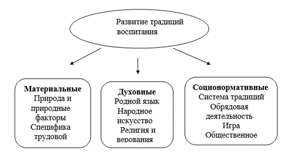 В этнопедагогике как виде деятельности духовная культура и традиции, язык, религия, быт, семейно-родственные и другие отношения выступают как основные средства воспитания и становления человека конкретного этноса.