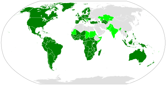 Диаграммада латын әліпбиінің әлемде таралуы көрсетілген. Латын әліпбиі ресми (немесе іс жүзінде ресми) жазба болып табылатын елдер қою жасыл түспен белгіленеді; ашық жасыл – латын алфавиті басқа жазбамен бірге қолданылатын жағдайлар.