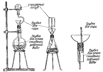 Мытье паром. В том случае, если посуда загрязнена жировыми веществами просто водой её хорошо не отмыть. В данной ситуации более эффективным способом будет мытьё струей водяного пара. Этот способ мытья является лучшим, но из-за затрат по времени редко применяется. Если обычно колбу можно вымыть за 5–10 минут, то для мытья паром нужен минимум один час [2]. Для мытья паром в колбу ёмкостью 3–5 литров до половины наливают воду, на дно для равномерного и спокойного кипения кладут несколько кусочков пемзы или стеклянные капилляры. Колбу плотно закрывают пробкой. В пробку вставляют трубку для подводки пара и воронку, через которую в колбу стекает конденсат. Конец воронки для предотвращения прорыва пара опускают в воду приблизительно на 2–3 см. Верхний конец трубки вводят в сосуд, который укрепляют в кольце или лапке штатива (рисунок 3.2) [2]. После мытья паром посуду, не перевертывая, высушивают или продуванием чистого воздуха, или в сушильном шкафу, или же просто на воздухе, но при этом нужно следить, чтобы не произошло её загрязнения.