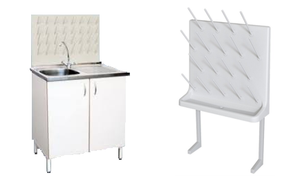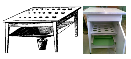 Стол для сушки посуды. В лабораториях встречаются столы для сушки посуды. Это стол, в крышке (или на полке под крышкой) которого имеются круглые отверстия (гнёзда) различного диаметра. Вымытую посуду опрокидывают и помещают на гнездо.