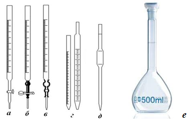 б) для точного измерения объемов: бюретки, пипетки, мерные колбы (рисунок 4.2).