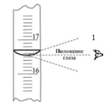 4.1.1 Определение положения мениска. Если жидкость заключить в узкую трубку, например в бюретку или пипетку, её поверхность заметно искривляется, это искривление называется мениском. При применении мерной посуды уровень смачивающих стекло прозрачных жидкостей (например, воды или водных растворов), устанавливают по нижнему краю вогнутого мениска (рисунок 4.3), а уровень непрозрачных или сильно окрашенных жидкостей (раствор КМnO4) – по его верхнему краю. Чтобы более точно установить этот минимум, позади градуированной шкалы помещают непрозрачный картон или кусок бумаги.