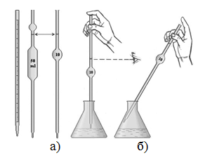Наполняют и опорожняют пипетки следующим образом. Опустив нижний конец пипетки в жидкость, засасывают резиновой грушей жидкость немного выше верхней метки. Затем быстро закрывают верхнее отверстие пипетки слегка смоченным указательным пальцем и осторожно ослабляют нажим пальца на отверстие пипетки так, чтобы нижний край мениска установился на метке. При этом пипетку держат так, чтобы метка находилась на уровне глаз, как показано на рисунке 4.4 (а). Усилив нажим пальца, прекращают вытекание жидкости из пипетки. Кончиком пипетки касаются стенок сосуда, из которого набирают жидкость, и быстро переносят пипетку к сосуду, в который должна быть влита жидкость. Держа пипетку вертикально над сосудом, прислонив её «носик» к стенке сосуда, ослабляют нажим пальца на верхний конец пипетки. Таким образом, уровень жидкости будет медленно понижаться. Как только он понизится до нижней метки (для пипеток на неполный слив), усиливают нажим на отверстие пипетки, выжидают 5–10 с и отнимают пипетку от стенки сосуда, как показано на рисунке 4.4 (б) [7].