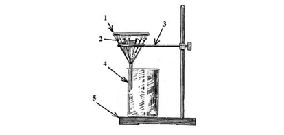 3 – кольцо для размещения воронки; 4 − стеклянный стакан; 5 – штатив