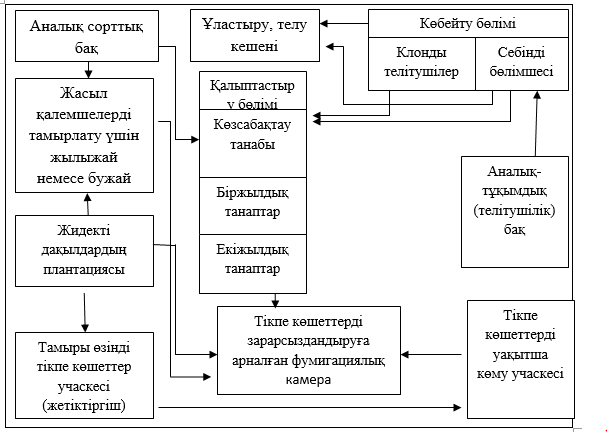 Жылыжайлар мен көктемелерде клонды телітушілердің жасыл қалемшелерін тамырландырады және олардан алхорының, шабдалының, шиенің, жидек дақылдарының өз тамырлары бар көшеттерін өсіреді. Температурасы реттеліп отырылатын мұздатқыштарда телінуші және телітуші материалдарын сақтайды, тұқымдар мен дәнектерді стратификация жасайды.