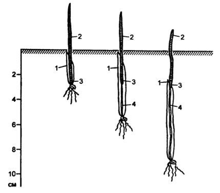 Рисунок 37 – Всходы пшеницы при разной глубине посева семян (по В. А. Кумакову, 1988)