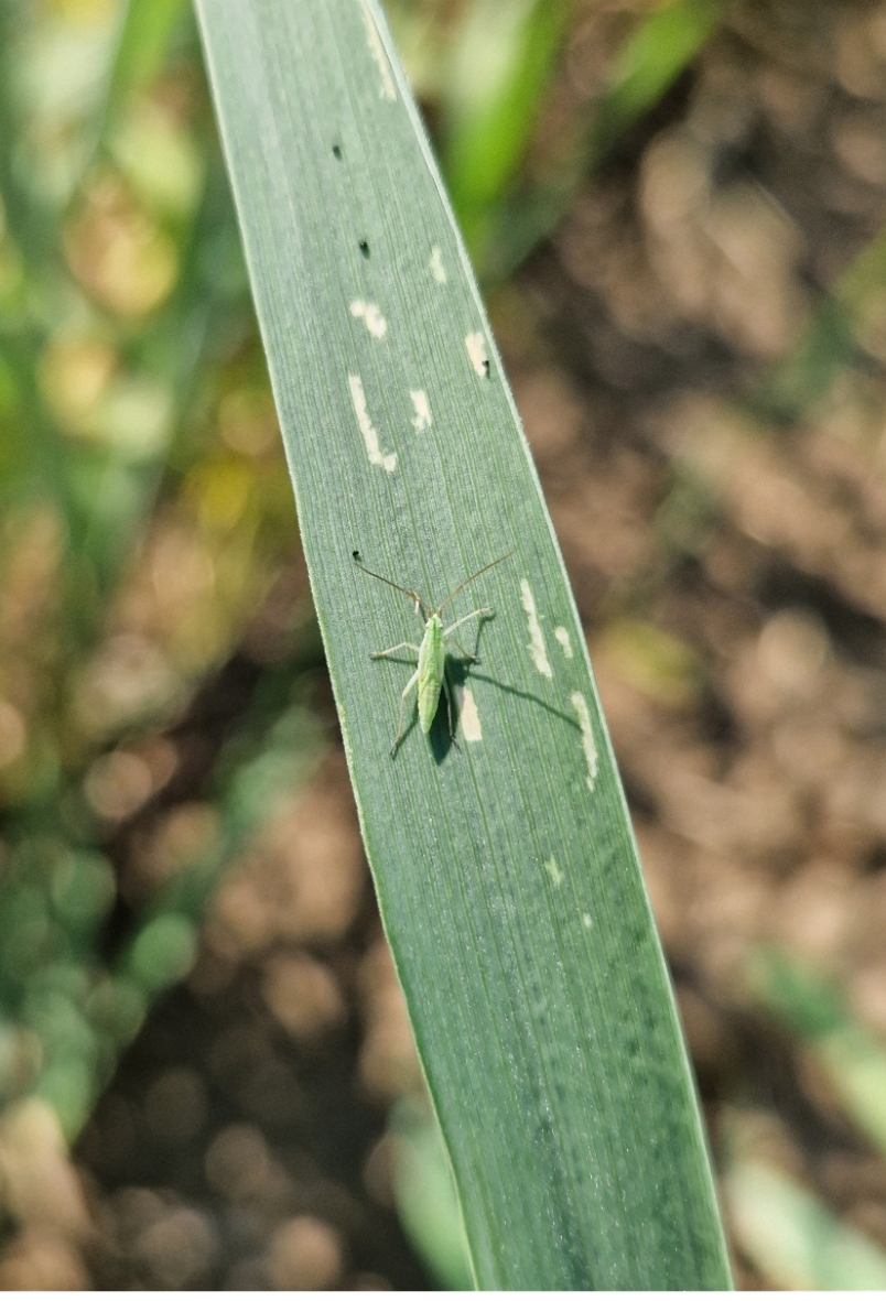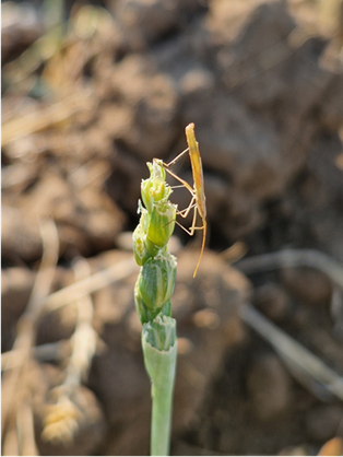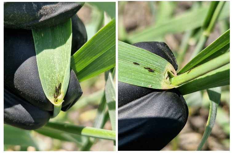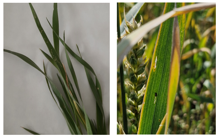 Для пшеничного трипса в посевах пшеницы характерна фенологическая адаптация, то есть тесная привязанность его жизненных циклов к фазам развития культуры [40–41]. Первые имаго фитофага можно наблюдать уже в фазе кущения пшеницы, к примеру, в Щербактинском районе – 4–5 шт. на 1 стебель, на отдельных полях до 10–20 шт. на 1 стебель, наибольшее количество трипсов отмечается в фазе колошения – до 20 шт. на 1 колосе, так как культура в эту фазу больше всего подходит для размножения вида. Имаго скапливаются в основании листа, питаясь соком растений, в местах питания появляются белесые пятна (рисунок 18).