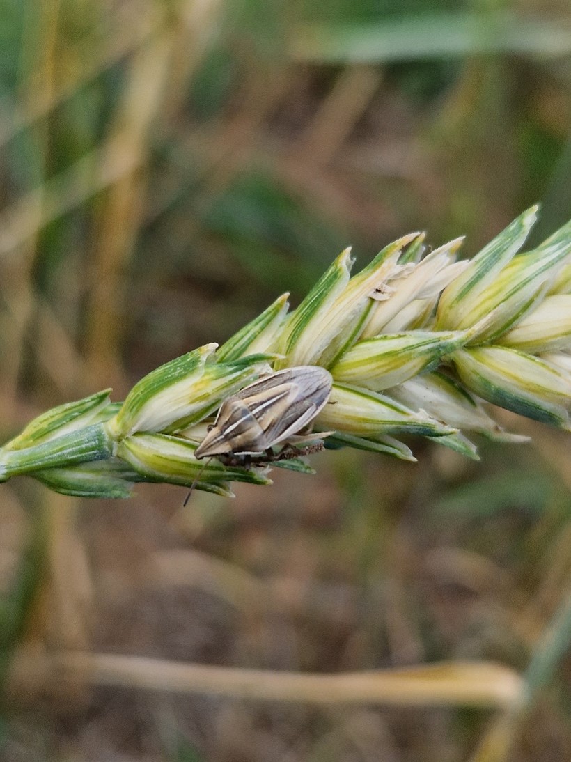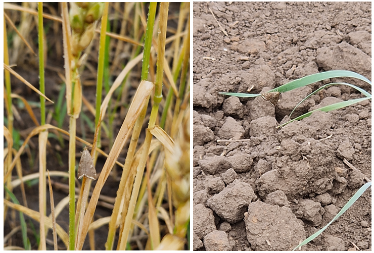 Хлебный клопик (Trigonotylus ruficornis) благодаря своей пластичности встречается в большом количестве в посевах яровой пшеницы. Вредит в течении всей вегетации культуры, характерные повреждения – обесцвечивание мест прокола клопика, так как он высасывает клеточный сок растений, что приводит к уменьшению ассимиляционной ткани и деформации зерна (рисунок 20). Вредоносность клопиков усиливается в засушливые годы, когда посевы пшеницы ослаблены из-за дефицита влаги и высоких температур воздуха. Погодные условия мая и летних месяцев 2022 года в целом по области отличались высокими температурами и недобором осадков в течении вегетации пшеницы, что способствовало увеличению численности хлебных клопиков, которая была наибольшая в период созревания зерна – от 10,3 до 67,7 % от общего количества всех фитофагов пшеницы. Личинки младших возрастов развиваются на природных стациях на различных злаковых травах или на полях на сорных растениях: житняк, пырей, куриное просо и др. В мае появляются взрослые насекомые, которые начинают перелетать на поля с посевами пшеницы, здесь же развивается второе и третье поколение насекомых. После уборки культуры клопики перелетают на природные стации на злаковые травы или на падалицу зерновых культур, откладывают яйца и имаго отмирает. С конца мая и до конца октября все три поколения чётко не разграничиваются и на растениях одновременно встречаются все стадии развития хлебного клопика. Численность его по районам варьировала от 2,19 % в Иртышском до 14,50 % в Успенском районах.