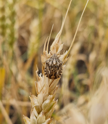 Клоп вредная черепашка (Eurygaster integriceps) опасный вредитель яровой пшеницы (рисунок 26). На зимовку клопы уходят под опавшие листья и растительные остатки на глубину 1–3 см, преимущественно в лесополосах или лесных колках. Лет клопов начинается при температуре воздуха около 10–12 °С, а массовый вылет при температуре 18–19 ºС. Дальность перелетов достигает иногда 100–200 км. При выравнивании соотношения обоих полов перелет завершается. До перелета на посевы пшеницы клопы питаются на многолетних злаковых травах, заселяют посевы культуры обычно в фазе кущения и на протяжении еще 1–3 недель. На посевах сразу же приступают к активному питанию и спариванию, чему способствует теплая погода. Установлено, что при численности 3–5 клопов на 1 м2 погибает до 40–50 % стеблей, при 8–10 шт. – 70–80 %. Откладка яиц происходит на нижнюю часть верхних листьев пшеницы, в кладке до 35–50 яиц, возможно и больше в зависимости от температуры и влажности воздуха. Установлено, что плодовитость самки при температуре воздуха 20–21 °С и относительной влажности 60–70 % составляет 150–200 яиц.