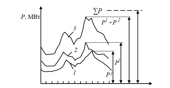 2.4 - сурет. Екі энергия жүйесінің тәуліктік жүктеме кестесі: 1, 2 - бөлек жұмыс; 3 - бірлескен жұмыс