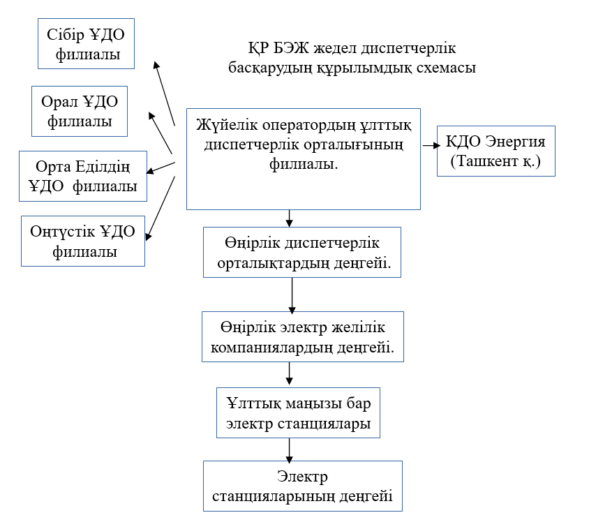 Диспетчерлік басқару "KEGOC" АҚ жүйе аралық электр желілері филиалдарының құрылымдық бөлімшелері болып табылатын тоғыз өңірлік диспетчерлік орталықтың (ӨДО) ЖО ҰДО-ға тікелей жедел бағыну схемасы бойынша ұйымдастырылған. Бұл Ақмола (Нұр-Сұлтан қ.), Ақтөбе (Ақтөбе қ.), Алматы (Алматы қ.), Шығыс (Өскемен қ.), Батыс (Атырау қ.), Қостанай (Қостанай қ.), Солтүстік (Екібастұз қ.), Орталық (Қарағанды қ.), Оңтүстік (Шымкент қ.) өңірлік диспетчерлік орталықтар. ЖО ҰДО барлық штаттан тыс жағдайларды дер кезінде жоя отырып, электр энергиясын жеткізудің қалыпты режимін қамтамасыз етеді, сондай-ақ ААҚ "ЖО БЭЖ", Сібір, Орал, Орта Еділ, Оңтүстік ОДБ-мен (Ресей БЭЖ) және "Энергия" КДО-мен (Орталық Азия БЭЖ) өзара іс-қимылда Қазақстан БЭЖ электр желілерінің және мемлекетаралық байланыстардың жұмыс режимін реттейді (сурет 2.6) [9].