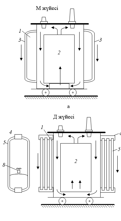 - Сур. 4.3, а табиғи айналымы бар "М" майлы салқындату жүйесі көрсетілген (трансформаторлар үшін 6,3 МВА дейін).