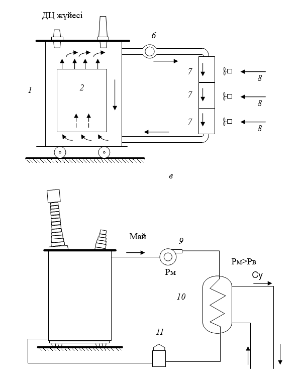 - Сур. 4.3. в, майдың мәжбүрлі айналымымен және радиаторларды үрлеу арқылы салқындатумен (трансформаторлар үшін 200 МВА дейін) "ДЦ" май салқындату жүйесін көрсетеді.