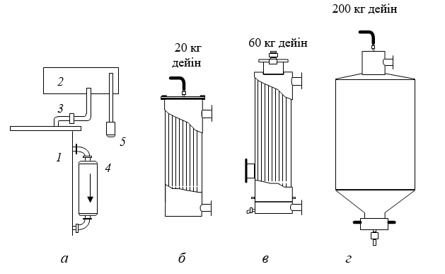 а - термосифон орнату; б-г - 10...200 кг силикагель адсорбентіне термосифон конструкциялары; 1 - трансформатор багы; 2 - кеңейткіш; 3 -газ релесі; 4 - термосифон сүзгісі; 5 - тыныс алу түтігіндегі ауа кептіргіштер