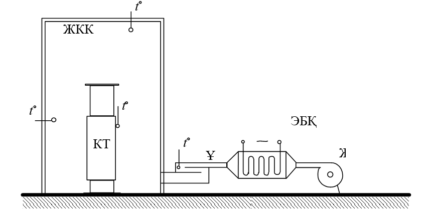 4.8 - сурет. Трансформаторды ауа үрлегіштің көмегімен кептіру, мұндағы tº – кедергі термометрлері немесе термопаралар; КТ -кептірілетін трансформатор; ЖКК – жылытылған кептіру камерасы; ҰҰ - ұшқын ұстағыш (металл тор); ЭБҚ – электр немесе бу қыздырғыш; Ж – желдеткіш