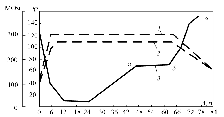 4.9 - сурет. Трансформаторды кептіру кестесі, мұнда 1 - ауа температурасы, 2 - оқшаулау температурасы; 3 - ораманың оқшаулау кедергісі