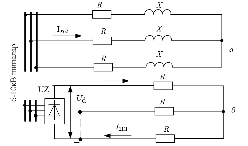 Мысал ретінде сурет 4.12 көктайғақты айнымалы токпен балқыту сұлбалары келтірілген (сурет 4.12, а) және тұрақты ток (сурет 4.14, б) жасанды қысқа тұйықталу режимінде.