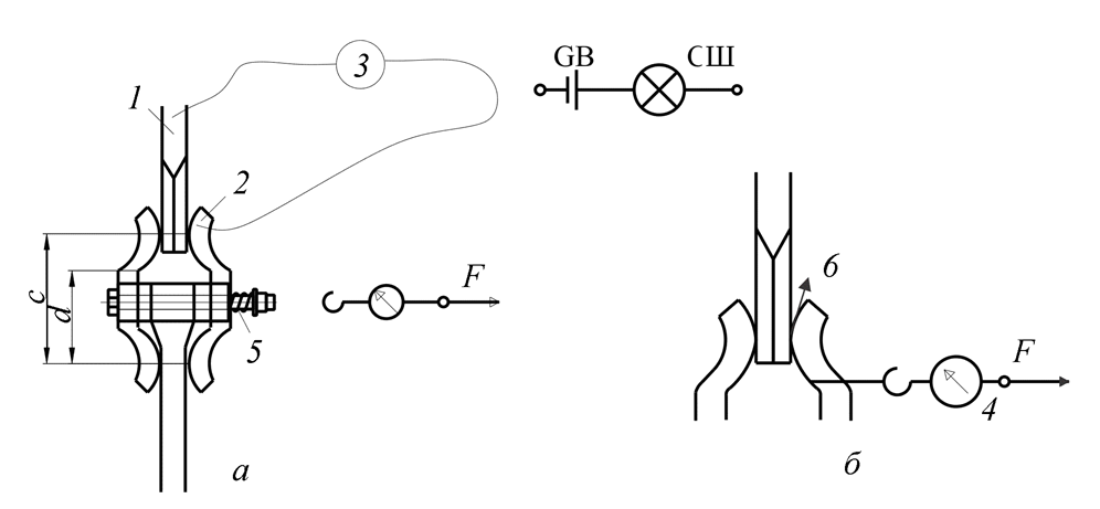 1 - қозғалмайтын байланыс; 2 - жылжымалы байланыс; 3 - омметр; 4 - динамометр; 5 - серіппе; 6 - щуп; GB - аккумулятор батареясы; СШ - сигнал шамы; F - түйіспелі басу күші; с - түйіспеден тірек нүктесіне дейінгі қашықтық, мм; d - динамометрдің ілу орнынан тірек нүктесіне дейінгі қашықтық, мм.