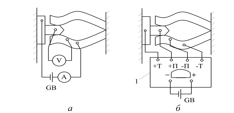 1 -тұрақты ток көпірі; GB - аккумуляторлық батарея; Т және П - ток және әлеуетті қысқыштар