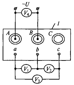 1 - күштік трансформатор; V1, V2, V3, V4 - вольтметрлер; U - желінің кернеуі; А, В, С - фазалар.