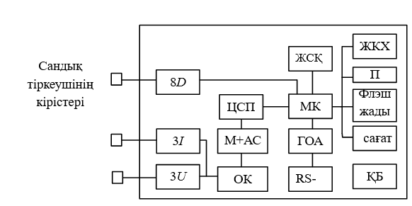 3I - ток датчиктері; 3U - кернеу датчиктері; 8D - дискретті сигналдарды енгізу датчиктері; ОК - операциялық күшейткіштер; М+АСТ - мультиплексорлар мен аналогты-цифрлық түрлендіргіштер блогы; ЦСП - цифрлық сигнал процессоры; МК - микроконтроллер; ЖСҚ - жедел сақтау құрылғысы; СКД - сұйық кристалды дисплей; РС-232 сериялық порты, ГОА - гальваникалық оптоэлектронды ажырату; ҚБ - қоректендіру блогы; П - пернетақта; сағат - нақты уақыт сағаттары