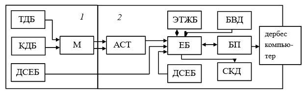1 - қолданылуы сынақ түріне байланысты өзгеретін сандық тіркеуші блоктары; 2 - қолданылуы сынақ түріне байланысты өзгермейтін сандық тіркеуші блоктары. ТДБ - ток датчиктерінің блогы; КДБ - кернеу датчиктерінің блогы; ДСЕБ - дискретті сигналдарды енгізу блогы; М -мультиплексор; АСТ - аналогты-сандық түрлендіргіш; СТІҚБ - сандық тіркеуді іске қосу блогы; ЕБ - есептеу блогы; ЭТЖБ - энергияға тәуелсіз жад блогы; ДЕБ - деректерді енгізу блогы; СКД - сұйық кристалды дисплей; БП - байланыс порты