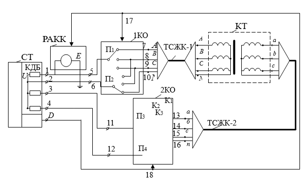 РАКК - реттелетін айнымалы кернеу көзі; СТ – сандық тіркеуші; 1КО - бірінші коммутациялық орган; 2КО - екінші коммутациялық орган; ТСЖК-1 - бірінші қосқыш төрт сымды кабель; ТСЖК-2 - екінші қосқыш төрт сымды кабель; КТ - сыналатын үш фазалы трансформатор