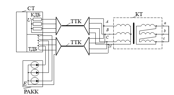 Сандық тіркеушіні қолдана отырып, электр трансформаторының орамаларының қысқа тұйықталу кедергісін автоматты түрде анықтау 6.10 суретте келтірілген құрылымдық электр тізбегі негізінде жүзеге асырылады. Құрылғы жалпы шығысы бар РАКК-ден тұрады; жалпы шығысы бар үш кернеу арнасы және үш ток арнасы бар сандық СТ тіркеушісі; төрт сымды ТКК кернеу кабельдері және ТТК тогы; зерттелетін қуат трансформаторы КТ.