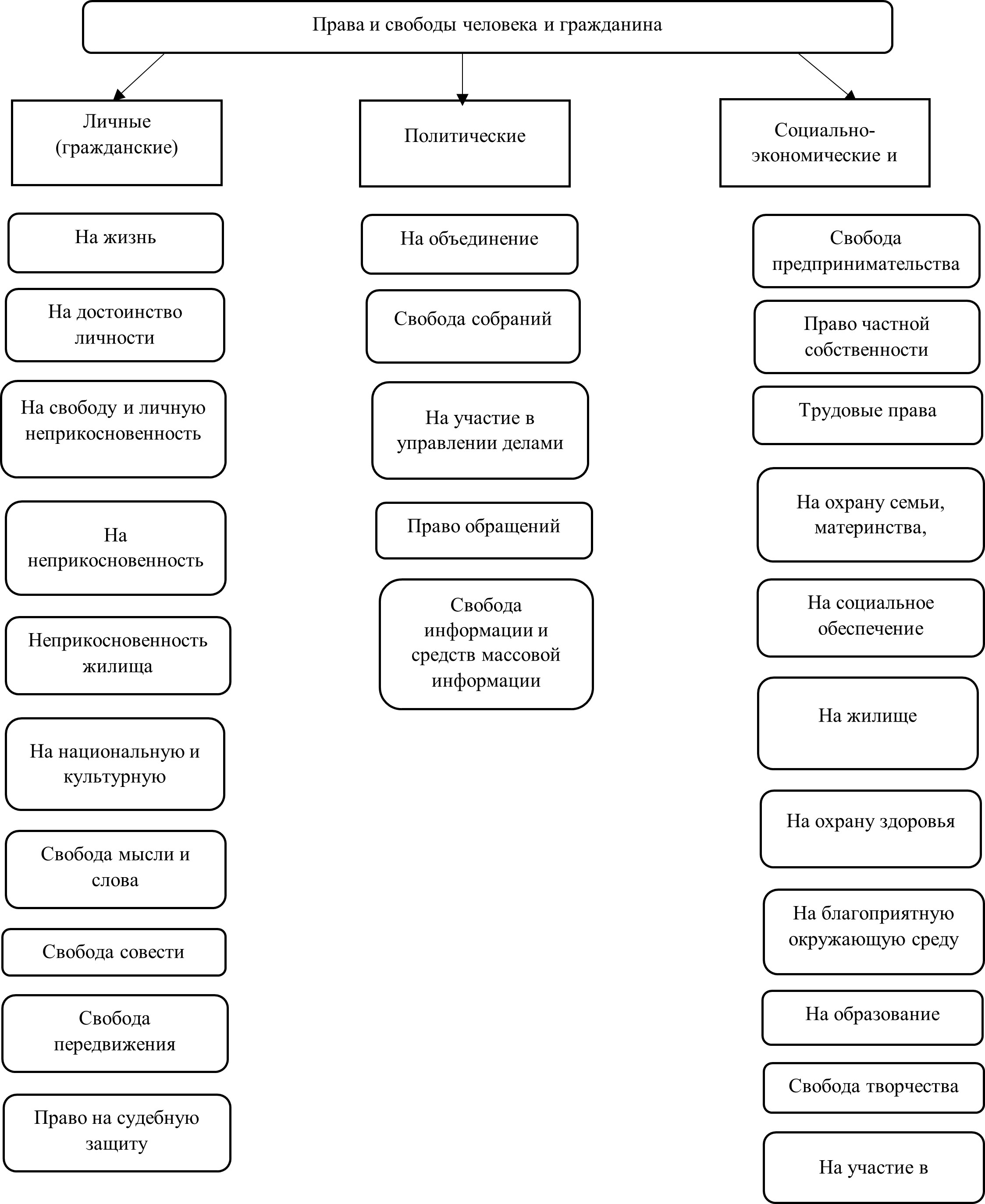 Наиболее разработанной и традиционной является классификация прав и свобод человека и гражданина по сферам проявления этих прав и свобод (рисунок 3.1). Эта классификация нормативно оформлена в многочисленных международных правовых актах, таких как Устав ООН 1945 г., Всеобщая декларация прав человека 1948 г., Международный пакт о гражданских и политических правах 1966 г., Международный пакт об экономических, социальных и культурных правах 1966 г., Устав Совета Европы, Европейская конвенция о защите прав человека и основных свобод 1950 г. и др.