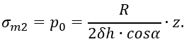 Здесь σm2 cosa – вертикальная составляющая меридионального напряжения. При определении площади, по которой действует давление рm, учтено, что δ∙≪∙r, т. е. принято(2r-δ)2≈(2r)2. Поверхность усеченного конуса, на которой возникают напряжения σm2 (ее площадь принята равной 2πrδ), показана отдельно на рисунке 1.15, г.