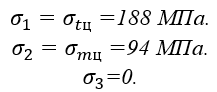 При построении эпюр главных напряжений, как обычно, принимаем, что радиальные напряжения равны нулю. Тогда на участке, где σt<0, главные напряжения равны: σ1=σm, σ2=0 и σ3=σt.