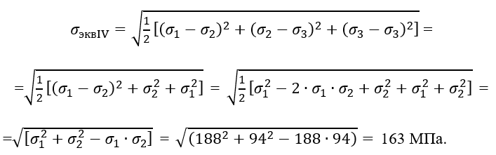 Вычислим эквивалентное напряжение для любой из опасных точек, применив гипотезу прочности энергии формоизменения (IV гипотеза прочности).