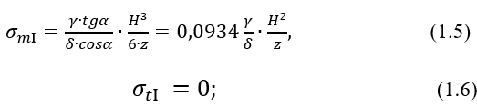Положим Н < H0. Тогда при построении эпюр напряжений σm и σt будем иметь два участка. Проводя сечение на первом (верхнем) участке (рисунок 1.28, а) и составляя уравнение равновесия, получаем
