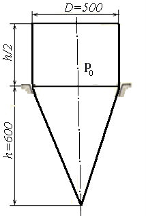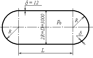 Пример 1. Построить эпюры меридиональных и окружных напряжений для тонкостенного резервуара, в котором находится газ под давлением р0= 20 кГ/см2(рисунок 1.13). Толщина стенки сосуда δ = 5 mm; диаметр срединной поверхности цилиндрической оболочки D= 2R= 500 mm. Резервуар считать невесомым.