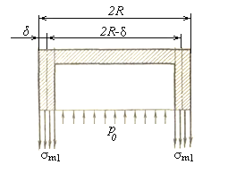 Рассечем цилиндрическую часть резервуара плоскостью, нормальной к его оси, отбросим нижнюю часть и заменим действие отброшенной части на оставленную соответствующими усилиями (рисунок 1.14). Это будут, во-первых, силы, соответствующие напряжениям, σm равномерно распределенным по сечению стенки резервуара, и, во-вторых, силы, обусловленные давлением газа р0, которое согласно «принципу отвердения» можно приложить непосредственно к газу, находящемуся в верхней части резервуара. Эти силы нормальны к секущей плоскости.