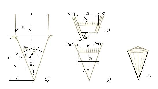 а) параметры конического сечения; б) расчётная схема верхней части конуса; в) расчётная схема нижней части конуса; г) поверхность усечённого конуса