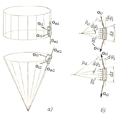 Вырезая такие элементы для каждой из оболочек (рисунок 1.18, а) и глядя на каждый из них вдоль образующей (рисунок 1.18, б), убеждаемся, что из условия ρt1 >ρ t2 при равных дугах ds следует dφ2 < dφ1. А поскольку в обоих случаях напряжения σt2 и σt1 должны уравновесить одну и ту же по величине равнодействующую силу давления p0,то из условия dφ2 < dφ1 следует σt2 >σ t1. Если произвести вычисления, то получим