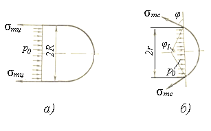 Проделаем то же самое для сферической части. Производя разрез нормальным коническим сечением, отбрасывая левую часть и заменяя ее действие на правую напряжениями σmc и давлением р0 (рисунок 1.2, б), получаем возможность определить σmc в сферической части из уравнения равновесия